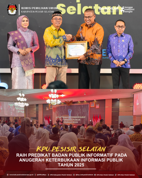 Painan — KPU Kabupaten Pesisir Selatan kembali menegaskan komitmennya dalam memberikan layanan informasi yang transparan kepada masyarakat. Hal ini dibuktikan dengan diraihnya Predikat Badan Publik Informatif pada Anugerah Keterbukaan Informasi Publik Se-Sumatera Barat Tahun 2025, yang diselenggarakan oleh Komisi Informasi Provinsi Sumatera Barat. Penganugerahan tersebut berlangsung di Auditorium Istana Gubernur Sumatera Barat, Selasa (18/11/2025). Penghargaan ini diberikan kepada badan publik yang dinilai berhasil menerapkan prinsip keterbukaan informasi secara optimal, mulai dari pelayanan informasi, pemenuhan standar layanan, hingga pemanfaatan teknologi dalam penyampaian informasi publik. Penghargaan ini sekaligus menempatkan KPU Kabupaten Pesisir Selatan sebagai salah satu badan publik yang konsisten dalam menjalankan amanat UU Keterbukaan Informasi Publik, serta membuktikan komitmen dalam memberikan akses informasi yang cepat, tepat, dan berkualitas kepada masyarakat. ....