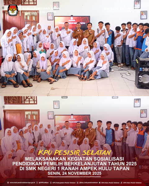 Painan — Ketua Komisi Pemilihan Umum Kabupaten Pesisir Selatan, Aswandi, melaksanakan kegiatan Sosialisasi Pendidikan Pemilih Berkelanjutan Tahun 2025 bertempat di SMK Negeri 1 Ranah Ampek Hulu Tapan pada Senin, 24/11/2025. Kegiatan ini diikuti oleh majelis guru, tenaga kependidikan, serta perwakilan siswa dari berbagai jurusan. Sosialisasi tersebut bertujuan untuk memberikan edukasi mengenai kepemiluan, meningkatkan pemahaman peserta didik tentang prinsip-prinsip demokrasi, serta mendorong partisipasi aktif generasi muda dalam proses politik di masa mendatang. Dalam sambutannya, Kepala SMK Negeri 1 Ranah Ampek Hulu Tapan, Aprison, S.Pd., M.M., menyampaikan apresiasi kepada KPU Kabupaten Pesisir Selatan atas terselenggaranya kegiatan tersebut. Lebih lanjut, Aprison menyampaikan harapan agar kegiatan sosialisasi ini tidak hanya berhenti pada penyampaian materi, tetapi juga dapat ditindaklanjuti melalui penguatan kapasitas kelembagaan siswa. “Kami berharap KPU dapat terus berperan dalam pembinaan organisasi siswa seperti OSIS, Pramuka, dan organisasi lainnya. Hal ini penting agar nilai-nilai demokrasi dapat dipraktikkan secara nyata di lingkungan sekolah,” tambahnya. Melalui kegiatan ini, Ketua KPU Kabupaten Pesisir Selatan, Aswandi berharap para siswa dapat memiliki kesadaran politik yang lebih baik, memahami pentingnya penggunaan hak suara, serta siap berpartisipasi secara bertanggung jawab ketika memasuki usia pemilih. ....