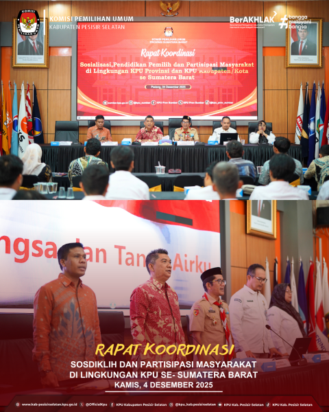 Padang - Komisi Pemilihan Umum (KPU) Kabupaten Pesisir Selatan, melalui Ketua Divisi Perencanaan Data dan Informasi Dede Desmana, bersama Kasubbag Perencanaan Data dan Informasi Indra Madan Putra serta Operator Sidalih Viona Harnike Azhari, turut berpartisipasi dalam kegiatan Konsultasi Persiapan Rekapitulasi Daftar Pemilih Berkelanjutan (PDPB) Triwulan IV. Agenda ini diikuti oleh seluruh KPU kabupaten/kota di Sumatera Barat. Kegiatan yang digelar KPU Provinsi Sumatera Barat pada Kamis, 13 November 2025 tersebut menjadi forum untuk melakukan evaluasi sekaligus menyamakan persepsi terkait pelaksanaan PDPB di tingkat daerah. Selain itu, konsultasi ini juga menjadi tahapan awal menuju Rapat Pleno PDPB tingkat provinsi yang direncanakan berlangsung pada awal Desember 2025. Turut hadir pada kegiatan tersebut Sekretaris KPU Provinsi Sumatera Barat, Irzal Zamzami dan Kasubag Data dan Informasi Rika Yulianti. ....