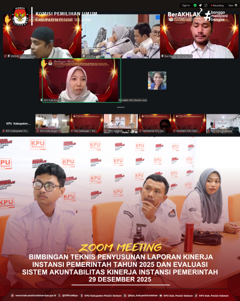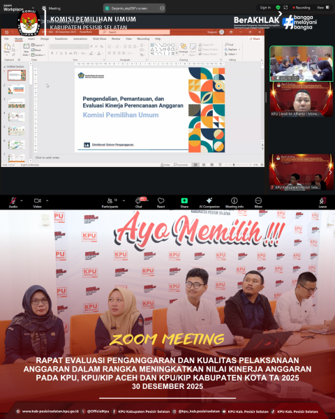 Painan - KPU Kabupaten Pesisir Selatan mengikuti Zoom Meeting Evaluasi Kinerja Penganggaran dan Kualitas Pelaksanaan Anggaran dalam rangka meningkatkan Nilai Kinerja Anggaran Tahun Anggaran 2025 yang diselenggarakan oleh KPU RI, Selasa (30/12/2025). Kegiatan ini diikuti oleh Plh Sekretaris, Kasubbag, serta staf terkait. Evaluasi ini bertujuan untuk mendorong peningkatan kualitas perencanaan dan pelaksanaan anggaran agar lebih transparan, efektif, dan akuntabel. Melalui kegiatan ini, KPU Kabupaten Pesisir Selatan berkomitmen untuk terus meningkatkan kinerja pengelolaan anggaran sebagai bagian dari upaya mewujudkan tata kelola kelembagaan yang profesional dan bertanggung jawab. ....