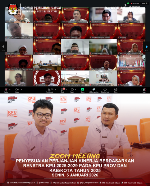 Painan — Komisi Pemilihan Umum (KPU) Kabupaten Pesisir Selatan mengikuti Rapat Penyesuaian Perjanjian Kinerja berdasarkan Rencana Strategis (Renstra) KPU Tahun 2025–2029 yang diselenggarakan oleh KPU Republik Indonesia secara daring, Senin (5/1/2026) pukul 14.00 WIB melalui Zoom Meeting. Rapat ini merupakan bagian dari upaya KPU RI dalam menyelaraskan Perjanjian Kinerja KPU Kabupaten/Kota Tahun 2025 agar sejalan dengan arah kebijakan, sasaran strategis, serta indikator kinerja yang telah ditetapkan dalam Renstra KPU 2025–2029. Melalui kegiatan ini, diharapkan seluruh satuan kerja KPU di tingkat daerah memiliki pemahaman yang sama terhadap target kinerja kelembagaan, sehingga pelaksanaan program dan kegiatan dapat berjalan lebih terarah, terukur, dan akuntabel. KPU Kabupaten Pesisir Selatan berkomitmen untuk menindaklanjuti hasil rapat tersebut dengan melakukan penyesuaian Perjanjian Kinerja sesuai arahan KPU RI. Penyesuaian ini diharapkan mampu mendukung peningkatan kualitas tata kelola organisasi serta penyelenggaraan pemilu yang profesional, transparan, dan berintegritas. Dengan adanya keselarasan antara perencanaan strategis dan perjanjian kinerja, KPU Kabupaten Pesisir Selatan optimistis dapat memberikan pelayanan kepemiluan yang semakin optimal kepada masyarakat. ....