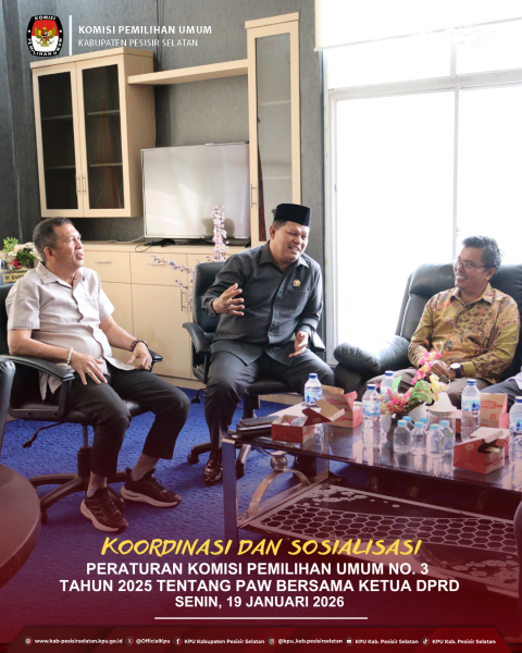 Painan – Komisi Pemilihan Umum melaksanakan pertemuan dengan Ketua Dewan Perwakilan Rakyat Daerah (DPRD) dalam rangka koordinasi dan sosialisasi Peraturan Komisi Pemilihan Umum (PKPU) Nomor 3 Tahun 2025 tentang Pergantian Antar Waktu (PAW). Kegiatan ini merupakan bagian dari upaya KPU dalam menyampaikan ketentuan terbaru terkait mekanisme PAW sesuai dengan regulasi yang berlaku. Dalam pertemuan tersebut, KPU menjelaskan secara komprehensif tahapan, prosedur, serta peran masing-masing lembaga dalam pelaksanaan PAW anggota DPRD. Sosialisasi ini diharapkan dapat meningkatkan pemahaman bersama serta memperkuat koordinasi dan sinergi antar lembaga, khususnya antara KPU dan DPRD. Pertemuan ini dihadiri oleh Ketua DPRD Darmansyah, Anggota DPRD Syafril Saputra, Ketua KPU Aswandi, Anggota KPU Dede Desmana dan Ruswandi Rinaldo, serta Sekretaris KPU Afnel Suryasman bersama kasubbag dan staf KPU Kabupaten Pesisir Selatan. ....