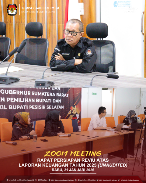 Painan - Komisi Pemilihan Umum Kabupaten Pesisir Selatan mengikuti Rapat Persiapan Reviu atas Laporan Keuangan Tahun 2025 (Unaudited) yang diselenggarakan oleh KPU Republik Indonesia secara daring melalui Zoom Meeting, Rabu (21/1/2026). Kegiatan ini dihadiri oleh Sekretaris KPU Kabupaten Pesisir Selatan, Kasubbag Keuangan, Umum, dan Logistik, Bendahara, serta Operator SAKTI Modul Pelaporan KPU Kabupaten Pesisir Selatan. Rapat persiapan ini dilaksanakan sebagai langkah mitigasi risiko terhadap potensi permasalahan yang dapat mempengaruhi kualitas Laporan Keuangan KPU Tahun 2025. Melalui kegiatan ini, diharapkan terbangun kesamaan pemahaman, kesiapan dokumen yang optimal, serta koordinasi yang solid antarunit kerja dalam pelaksanaan reviu laporan keuangan. ....