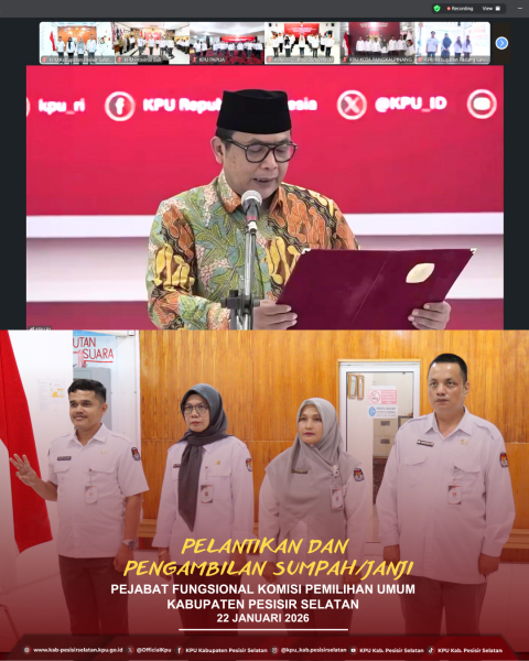Painan – Sebanyak sepuluh orang Pegawai Negeri Sipil (PNS) Sekretariat KPU Kabupaten Pesisir Selatan mengikuti pelantikan dan pengambilan sumpah/janji Jabatan Fungsional Penata Kelola Pemilu Ahli Pertama pada Kamis, 22 Januari 2026. Pelantikan ini diikuti oleh jajaran pejabat fungsional di lingkungan KPU Kabupaten Pesisir Selatan sebagai bagian dari upaya peningkatan profesionalisme, integritas, dan kinerja aparatur dalam memberikan pelayanan terbaik kepada masyarakat. Secara nasional, kegiatan pelantikan dipimpin oleh Sekretaris Jenderal KPU Bernad Dermawan Sutrisno dan dihadiri oleh Ketua KPU RI Mochammad Afifuddin, baik secara langsung maupun daring. Pelantikan dilaksanakan serentak di lingkungan Sekretariat Jenderal KPU, Sekretariat KPU Provinsi/KIP Aceh, serta Sekretariat KPU/KIP Kabupaten/Kota di seluruh Indonesia. ....