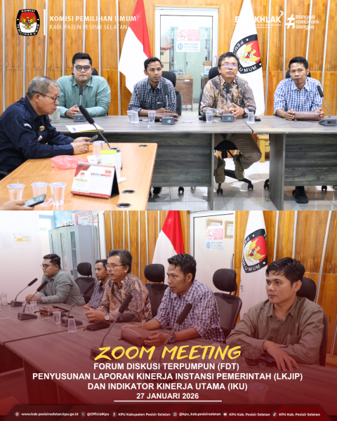 Painan — Komisi Pemilihan Umum (KPU) Kabupaten Pesisir Selatan mengikuti kegiatan Forum Diskusi Terpumpun (FDT) dalam rangka penyusunan Laporan Kinerja Instansi Pemerintah (LKjIP) KPU Tahun 2025 serta penyusunan Cascading Kinerja dan Indikator Kinerja Utama (IKU) KPU, KPU Provinsi, dan KPU Kabupaten/Kota Tahun 2025–2029. Kegiatan tersebut dilaksanakan secara daring melalui Zoom Meeting pada Selasa (27/01/2026) dan diikuti oleh jajaran KPU Kabupaten Pesisir Selatan dari ruang rapat kantor KPU Kabupaten Pesisir Selatan. Forum diskusi ini bertujuan untuk menyamakan persepsi serta memperkuat pemahaman seluruh jajaran KPU terhadap arah kebijakan dan sistem kinerja lembaga ke depan. Dalam FDT tersebut, peserta membahas secara mendalam keterkaitan antara perencanaan kinerja, pengukuran capaian, serta penyusunan indikator yang selaras dari tingkat pusat hingga daerah. Melalui kegiatan ini, KPU Kabupaten Pesisir Selatan diharapkan mampu menyusun LKjIP yang lebih akuntabel, transparan, dan berkualitas. Selain itu, perumusan Cascading Kinerja dan IKU yang terstruktur juga diharapkan dapat mencerminkan tugas, fungsi, serta target kinerja KPU secara berjenjang dan terukur. Ketua KPU Kabupaten Pesisir Selatan menyampaikan bahwa kegiatan FDT ini menjadi momentum penting dalam meningkatkan kualitas tata kelola kelembagaan. “Dengan adanya forum ini, kami semakin memahami arah kebijakan kinerja KPU ke depan sehingga dapat meningkatkan profesionalisme dan pelayanan kepada masyarakat,” ujarnya. KPU Kabupaten Pesisir Selatan berkomitmen untuk terus meningkatkan kinerja lembaga secara berkelanjutan demi mewujudkan penyelenggaraan pemilu yang berintegritas, demokratis, dan terpercaya. ....