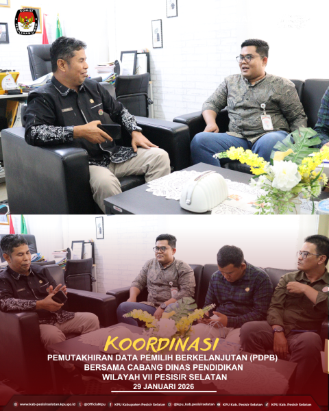 Painan - Dalam rangka pemutakhiran data pemilih berkelanjutan tahun 2026, Komisi Pemilihan Umum Kabupaten Pesisir Selatan melaksanakan koordinasi dengan Cabang Dinas Pendidikan Wilayah VII Pesisir Selatan terkait pendataan pemilih pemula, khususnya siswa/i SMA dan SMK. Kegiatan ini disambut langsung oleh Bapak Nasril selaku Kasi SMK, serta dihadiri oleh jajaran KPU Kabupaten Pesisir Selatan, yaitu Dede Desmana, S.Kom., MM selaku Ketua Divisi Perencanaan Data dan Informasi, Indra Madan Putra, S.Kom., M.Si selaku Kasubbag Perencanaan Data dan Informasi, serta Debi Filanda, S.Kom, Canang Bagus Prahara Umpu,S.I.P, dan Viona Harnike Azhari,S.Kom sebagai staf Perencanaan Data dan Informasi. Melalui koordinasi ini, diharapkan terwujud data pemilih yang akurat, mutakhir, dan berkualitas, serta meningkatnya partisipasi pemilih pemula dalam demokrasi. ....