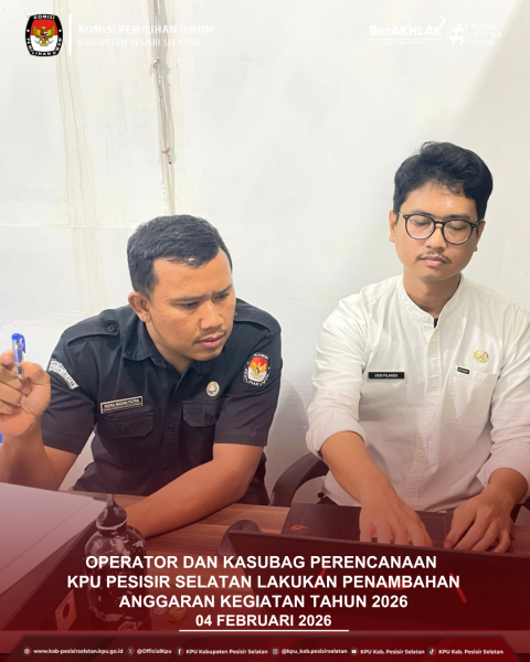 Painan – Operator dan Kepala Subbagian Perencanaan, Data, dan Informasi Sekretariat KPU Kabupaten Pesisir Selatan melaksanakan kegiatan penambahan anggaran berdasarkan hasil Rapat Pleno yang dilaksanakan pada tanggal 3 Februari 2026. Rapat Pleno tersebut telah menyepakati penambahan anggaran kegiatan Tahun 2026 sebagai bagian dari upaya penguatan perencanaan dan dukungan terhadap pelaksanaan program kerja KPU Kabupaten Pesisir Selatan. Penambahan anggaran ini diharapkan dapat menunjang pelaksanaan kegiatan secara lebih optimal, efektif, dan berkelanjutan. Melalui komitmen bersama yang telah disepakati dalam Rapat Pleno, KPU Kabupaten Pesisir Selatan terus berupaya meningkatkan kualitas kinerja serta pelayanan kepada masyarakat. Langkah ini menjadi bagian dari proses perencanaan yang akuntabel dan berorientasi pada peningkatan kinerja kelembagaan ke depan. ....