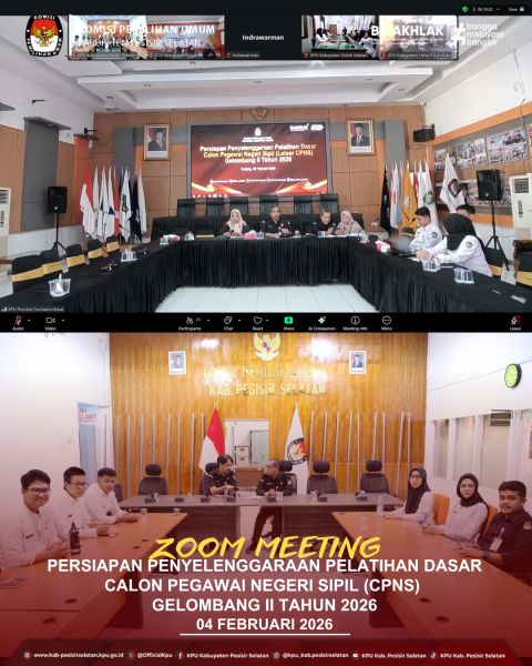 Painan – Komisi Pemilihan Umum (KPU) Kabupaten Pesisir Selatan mengikuti kegiatan Persiapan Penyelenggaraan Pelatihan Dasar Calon Pegawai Negeri Sipil (Latsar CPNS) di lingkungan KPU se-Sumatera Barat. Kegiatan ini diselenggarakan oleh KPU Provinsi Sumatera Barat bekerja sama dengan Balai Besar Pengembangan Kompetensi Aparatur Pemerintah Dalam Negeri I. Kegiatan tersebut dilaksanakan secara daring melalui aplikasi Zoom pada Rabu, 4 Februari 2026, dan diikuti oleh seluruh satuan kerja KPU kabupaten/kota se-Sumatera Barat, termasuk KPU Kabupaten Pesisir Selatan. Persiapan penyelenggaraan Latsar CPNS ini bertujuan untuk memberikan pemahaman awal terkait mekanisme, materi, serta teknis pelaksanaan pelatihan dasar bagi calon aparatur sipil negara di lingkungan KPU. Selain itu, kegiatan ini juga menjadi wadah koordinasi dalam memastikan pelaksanaan Latsar berjalan secara efektif dan sesuai dengan ketentuan yang berlaku. Melalui kegiatan ini, para CPNS di lingkungan KPU diharapkan dapat dibekali dengan nilai-nilai dasar ASN, integritas, profesionalisme, serta komitmen terhadap tugas dan tanggung jawab sebagai penyelenggara pemilu. KPU Kabupaten Pesisir Selatan menyambut baik pelaksanaan kegiatan ini sebagai bagian dari upaya peningkatan kualitas sumber daya manusia. Dengan persiapan yang matang, diharapkan CPNS KPU mampu menjalankan tugas secara optimal dalam mendukung terselenggaranya pemilu yang jujur, adil, dan berkualitas. Ke depan, KPU Kabupaten Pesisir Selatan berkomitmen untuk terus mendukung pengembangan kompetensi aparatur melalui berbagai program pembinaan dan pelatihan, guna mewujudkan kelembagaan yang profesional, berintegritas, dan berorientasi pada pelayanan publik. ....