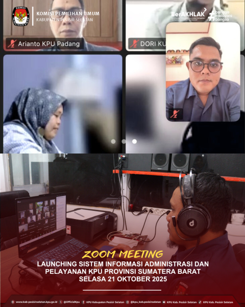 Painan, 21 Oktober 2025 — Komisi Pemilihan Umum (KPU) Kabupaten Pesisir Selatan mengikuti kegiatan Launching Sistem Informasi Administrasi dan Pelayanan KPU Provinsi Sumatera Barat yang dilaksanakan secara virtual melalui Zoom Meeting, pada Selasa, 21 Oktober 2025.