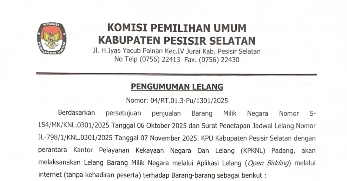 Berdasarkan persetujuan penjualan Barang Milik Negara Nomor S-154/MK/KNL.0301/2025 Tanggal 06 Oktober 2025 dan Surat Penetapan Jadwal Lelang Nomor JL-798/1/KNL.0301/2025 Tanggal 07 November 2025. KPU Kabupaten Pesisir Selatan dengan perantara Kantor Pelayanan Kekayaan Negara Dan Lelang (KPKNL) Padang, akan melaksanakan Lelang Barang Milik Negara melalui Aplikasi Lelang (Open Bidding) melalui internet (tanpa kehadiran peserta) terhadap Barang-barang sebagai berikut :