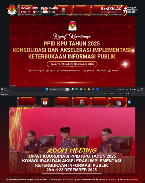 Painan — Komisi Pemilihan Umum Republik Indonesia (KPU RI) menyelenggarakan Rapat Koordinasi Pejabat Pengelola Informasi dan Dokumentasi (PPID) KPU Tahun 2025 dengan tema Konsolidasi dan Akselerasi Implementasi Keterbukaan Informasi Publik. Kegiatan ini dilaksanakan secara daring melalui platform Zoom Meeting selama tiga hari, mulai tanggal 20 hingga 22 Desember 2025.