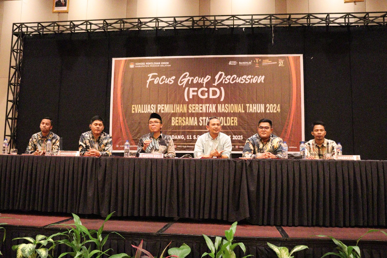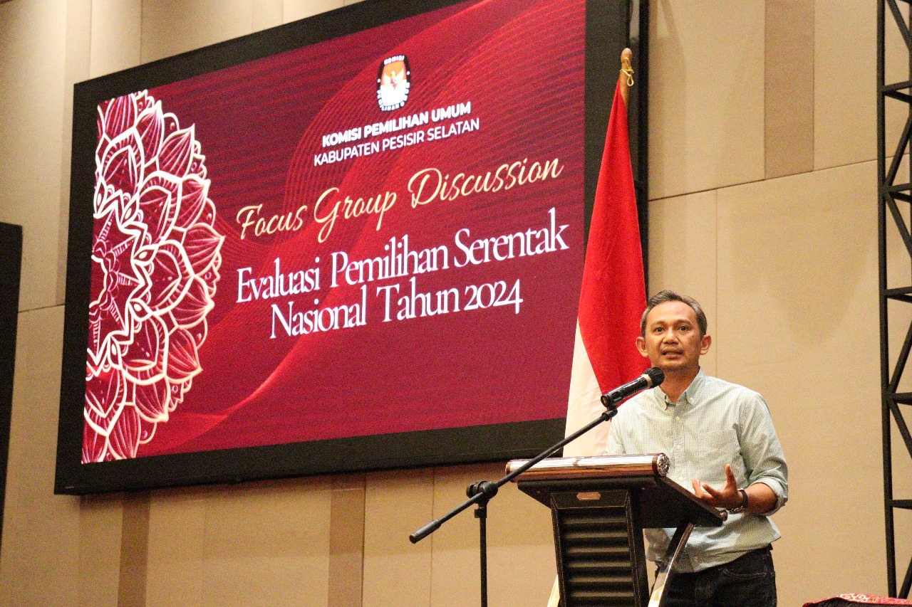 Focus Group Discussion (FGD) Evaluasi Pemilihan Serentak Nasional Tahun 2024 yang diadakan oleh KPU Kabupaten Pesisir Selatan dihadiri oleh 178 (seratus tujuh puluh delapan peserta) yang terdiri dari beberapa lembaga dan stakeholder terkait. Kegiatan tersebut dibuka langsung oleh ketua KPU Kabupaten Pesisir Selatan Aswandi. Dalam sambutannya beliau menyampaikan Focus Group Discussion (FGD) Evaluasi Pemilihan Serentak Nasional Tahun 2024 ini dapat menjadikan sarana evaluasi bagi KPU Kabupaten Pesisir Selatan dalam melaksanakan pemilihan dimasa mendatang.