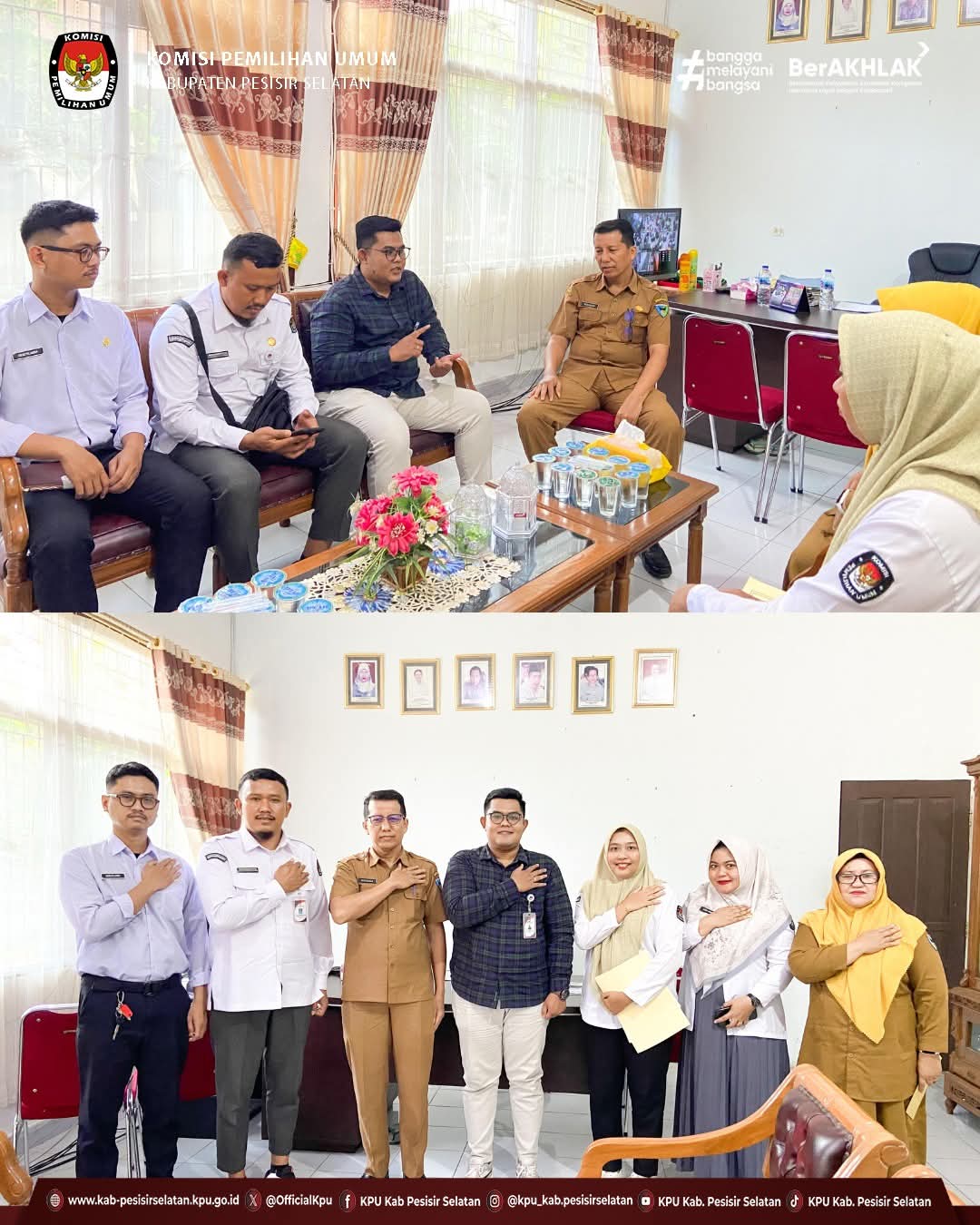 Painan - Ketua Divisi Perencanaan Data dan Informasi Komisi Pemilihan Umum Kabupaten Pesisir Selatan Dede Desmana, S.Kom., MM berserta Kepala Sub Bagian Program dan Data Indra Madan Putra, S.Kom., M.Si beserta Staf Debi Filanda,S.Kom, Viona Harnike Azhari,S.Kom dan Atika Naselva, S.Pt mengunjungi Dinas Kependudukan dan Pencatatan Sipil untuk berkoordinasi Terkait Data Pemilih Berkelanjutan (DPB) Senin, 16 Juni 2025.