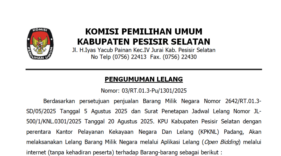 Berdasarkan persetujuan penjualan Barang Milik Negara Nomor 2642/RT.01.3-SD/05/2025 Tanggal 5 Agustus 2025 dan Surat Penetapan Jadwal Lelang Nomor JL-500/1/KNL.0301/2025 Tanggal 20 Agustus 2025. KPU Kabupaten Pesisir Selatan dengan perentara Kantor Pelayanan Kekayaan Negara Dan Lelang (KPKNL) Padang, Akan melaksanakan Lelang Barang Milik Negara melalui Aplikasi Lelang (Open Bidding) melalui internet (tanpa kehadiran peserta) terhadap Barang-barang sebagai berikut :