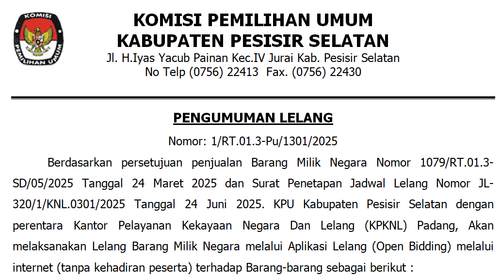 Berdasarkan persetujuan penjualan Barang Milik Negara Nomor 1079/RT.01.3-SD/05/2025 Tanggal 24 Maret 2025 dan Surat Penetapan Jadwal Lelang Nomor JL-320/1/KNL.0301/2025 Tanggal 24 Juni 2025. KPU Kabupaten Pesisir Selatan dengan perentara Kantor Pelayanan Kekayaan Negara Dan Lelang (KPKNL) Padang, Akan melaksanakan Lelang Barang Milik Negara melalui Aplikasi Lelang (Open Bidding) melalui internet (tanpa kehadiran peserta) Informasi lebih lanjut Silakan Klik disini!