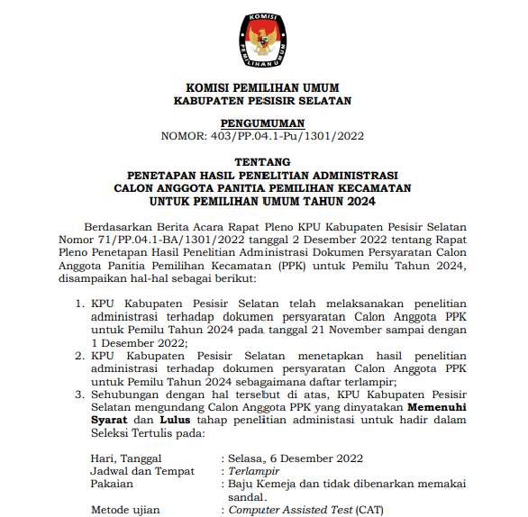 KPU Kabupaten Pesisir Selatan melalui Rapat Pleno Penetapan Hasil Penelitian administrasi Calon Anggota Panitia Pemilihan Kecamatan (PPK) resmi menetapkan nama nama yang lulus pada tahapan seleksi penelitian administrasi Calon Anggota PPK untuk Pemilu tahun 2024. Rapat pleno penetapan dilaksanakan pada Selasa 2 Desember 2022. Selanjutnya peserta yang dinyatakan lulus akan mengikuti seleksi tertulis dengan metode Computer Assisted Test (CAT) pada Selasa, 6 Desember 2022. Seleksi ini dilaksakan pada 3 titik lokasi yaitu SMK N 1 Painan, SMA N 1 Ranah Pesisir dan SMA N 1 Basa Ampek Balai Tapan. Berikut daftar nama Calon Anggota PPK yang dinyatakan lulus seleksi administrasi.