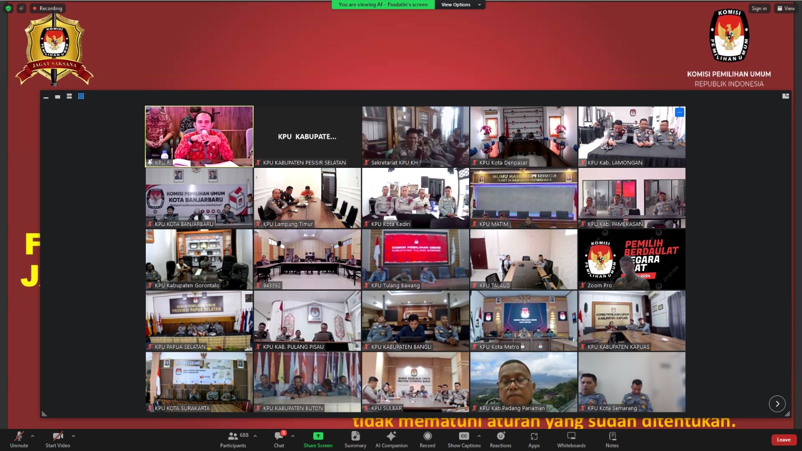 Painan – Jagat Saksana KPU Kabupaten Kabupaten Pesisir Selatan mengikuti Rapat Evaluasi Kinerja Personil Jagat Saksana Triwulan II Tahun 2025. Pelaksanaan Rapat melalui Zoom Meeting yang dilaksanakan oleh Komisi Pemilihan Umum Republik Indonesia. Rapat Evaluasi yang dipimpin langsung oleh Bapak Sumanto selaku Kepala Bagian Keamanan KPU RI, pada hari Jumat, 29 Agustus 2025 yang diikuti semua Jagat Saksana KPU Provinsi dan KPU Kabupaten/Kota.