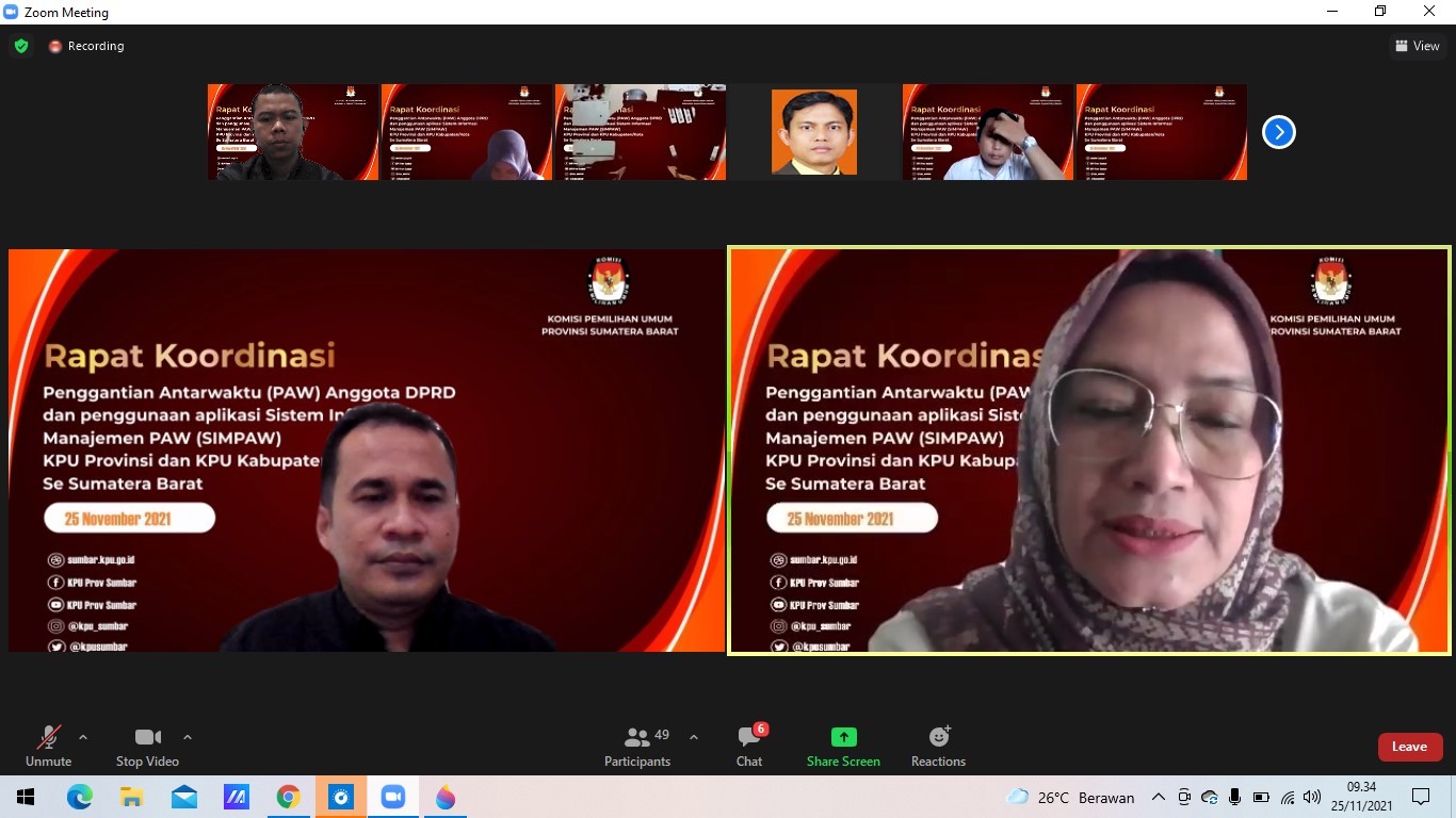 Painan --- KPU Kabupaten Pesisir Selatan dan KPU Kabupaten/Kota se-Provinsi Sumatera Barat mengikuti Rapat Koordinasi Penggantian Antarwaktu Anggota DPRD Provinsi/Kabupaten/Kota dan penggunaan aplikasi Sistem Informasi Manajemen PAW (SIMPAW) secara daring, Kamis (25/11/2021). Kegiatan yang diselenggarakan oleh KPU Provinsi Sumatera Barat, menghadirkan Anggota KPU RI Evi Novida Ginting Manik dan Sub Koordinator Pencalonan DPR, DPRD dan PAW Setjen KPU RI Yulia Sari. Evi menekankan kepada KPU Provinsi maupun KPU Kabupaten/Kota agar patuh pada ketentuan peraturan KPU (PKPU) terkait PAW. “Proses permintaan nama PAW dari pimpinan DPRD memperhatikan batasan waktu, yakni 5 hari sejak diterima surat permintaan tersebut”, tegas Evi. Beliau juga menegaskan untuk tidak menanggapi secara berlebihan proses PAW dari batas waktu yang dimiliki KPU, agar penyampaian nama PAW anggota DPRD segera disampaikan kepada pimpinan DPRD jika memang ada masukan dan tanggapan dari masyarakat atau ada proses klarifikasi terhadap hal tersebut. Sementara Yulia Sari memaparkan hal teknis terkait penggunaan aplikasi Sistem Informasi Penggantian Antar Waktu (SIMPAW). Tujuan aplikasi tersebut adalah untuk mempermudah pendokumentasian dan pengadministrasian proses PAW anggota DPR/DPRD Provinsi/DPRD Kabupaten/Kota, serta sebagai bentuk transparansi dan keterbukaan informasi publik dalam proses PAW sehingga publik pun dapat mengetahui berjalannya proses tersebut melalui link https://simpaw.kpu.go.id/ Plh. Ketua KPU Sumbar Yuzalmon pada sambutannya saat membuka rakor mengingatkan agar KPU Provinsi dan KPU Kabupaten/Kota memastikan semua persyaratan dalam proses PAW terpenuhi, sehingga sangat dibutuhkan kecermatan, kehati-hatian, dan ketelitian.(*)