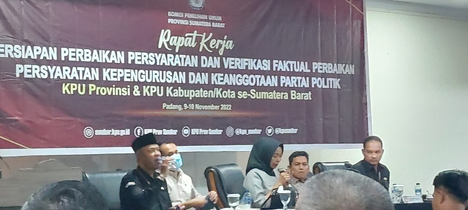 Padang. KPU Provinsi Sumatera Barat melaksanakan Rapat Kerja Persiapan Perbaikan Persyaratan dan Verifikasi Faktual Perbaikan Persyaratan Kepengurusan dan Keanggotaan Partai Politik yang dihadiri oleh KPU Kabupaten/Kota Se-Sumatera Barat pada tanggal 9-10 November 2022, bertempat di Hotel Trumtum Padang. Rapat Kerja fokus pada kendala-kendala pada tahap Verifikasi Faktual awal yang dituangkan dalam Daftar Inventarisir Masalah (DIM), dan solusi-solusi penyelesaian masalah tersebut jika kembali terjadi pada Verifikasi Faktual Perbaikan. DIM ini langsung disampaikan Ketua Divisi Teknis Penyelenggaraan Pemilu di setiap KPU Kabupaten/Kota. Yon Baiki, S.Pd.I., M.Ag (Ketua Divisi Teknis Penyelenggaraan Pemilu KPU Kabupaten Pesisir Selatan) menyampaikan terdapat beberapa kendala teknis yang dihadapi oleh KPU Kabupaten Pesisir Selatan pada verifikasi faktual awal. Namun kendala-kendala tersebut telah dicarikan solusi, sehingga pelaksanaan verifikasi faktual baik kepengurusan maupun keanggotaan Partai Politik dapat terlaksana dengan baik serta sesuai dengan ketentuan peraturan Per Undang-Undangan. Setelah seluruh penyampaian selesai Ketua Divisi Teknis Penyelenggaraan Pemilu KPU Provinsi Sumatera Barat Gebril Daulai memberikan arahan dan solusi terkait permasalahan-permasalahan yang telah disampaikan tersebut. Gebril juga menegaskan, bahwa rekomendasi yang diberikan oleh KPU Kabupaten/kota akan menjadi catatan dan akan disampaikan ke KPU RI. Rapat Kerja kemudian ditutup oleh Ketua KPU Provinsi Sumatera Barat, Yanuk Sri Mulyani.