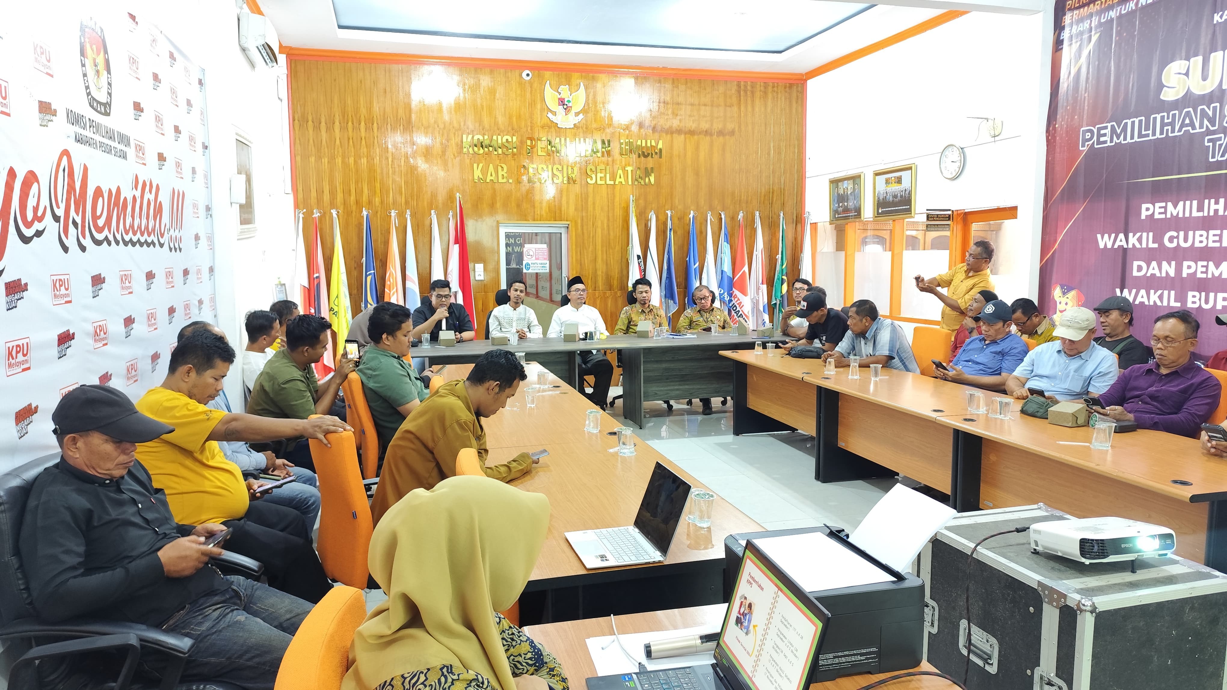 Painan - Bertujuan agar tahapan Pilkada Serentak semakin tersebar luas di tengah masyarakat, KPU Kabupaten Pesisir Selatan kembali mengadakan Sosialisasi Tahapan Pilkada 2024 Bersama Media-Se Kabupaten Pesisir Selatan yang dilaksanakan pada hari Jumat, 20 September 2024 pukul 14.00 s.d selesai, bertempat di Kantor KPU Kabupaten Pesisir Selatan. "Masih banyak tahapan yang harus dilakukan oleh KPU, untuk tahapan terdekat ada empat, yakni penetapan pasangan calon, pengundian nomor urut dan deklarasi kampanye damai, pelaporan dana kampanye dan pembentukan KPPS. Penetapan pasangan calon akan dilaksanakan pada tanggal 22 September, kemudian dilanjutkan dengan pengundian nomor urut dan deklarasi kampanye damai pada tanggal 23 September 2024 bertempat di Painan Covention Center" ujar Ketua KPU Pessel Aswandi dalam sambutannya. Ketua Divisi Teknis Penyelenggaraan Pemilu, Syafrijal Chan menambahkan, bahwa KPU Pessel sudah menyiapkan SOP terkait pengundian nomor urut. "Rekan-rekan media diakomodir sebanyak 50 orang untuk dapat melakukan peliputan pada kegiatan tersebut" pungkasnya. Chan kemudian memaparkan terkait pembatasan dana kampanye dan jadwal pelaporan dana kampanye yang dilakukan oleh Pasangan Calon. Pada sesi selanjutnya, Rahmat, Ketua Divisi Sosdiklih Parmas dan SDM menyampaikan beberapa hal terkait deklarasi kampanye damai. Rahmat menyampaikan bahwa dalam deklarasi kampanye damai ini, pasangan calon akan diminta untuk membaca naskah deklarasi kampanye damai dilanjutkan dengan penandatangan. Terkait pembentukan KPPS, Rahmat menyampaikan bahwa jajaran PPS sudah mengumumkan pembukaan pendaftaran sejak dari tanggal 17 September 2024 yang lalu. "Kami harapkan rekan-rekan media dapat membantu penyebaran informasi terkait pembentukan KPPS ini, agar seluruh kebutuhan KPPS pada pilkada 2024 ini dapat terpenuhi" pungkasnya. Kadiv Perdatin KPU Pessel, Dede Desmana pada kesempatan berikutnya menyampaikan beberapa hal terkait Layanan Pindah Memilih yang bisa dilakukan oleh masyarakat. "Harapannya bahwa dengan kegiatan sosialisasi bersama media ini, Layanan pindah memilih dapat tersebar ditengah masyarakat, sehingga seluruh masyarakat yang berhak memilih dapat menggunakan hak pilihnya" ujar Dede. Acara kemudian dilanjutkan dengan sesi tanya jawab. Beberapa wartawan penanya diantaranya berasal dari Harian Posmetro, Harian Padang Ekspres dan TVRI Padang cukup antuasias mengajukan pertanyaan terkait dana kampanye, iklan kampanye serta pembentukan KPPS. (Humas KPU Pessel)