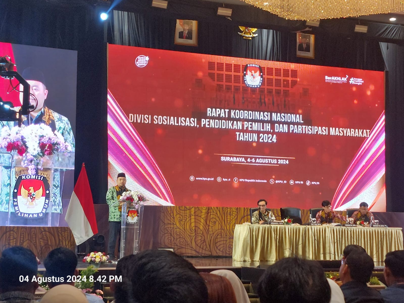 Surabaya. Komisi Pemilihan Umum Republik Indonesia mengadakan Rapat Koordinasi, Pendidikan Pemilih dan Partisipasi Masyarakat dengan KPU Provinsi/KIP Aceh dan KPU Kabupaten/Kota pada tanggal 4 s.d 6 Desember 2024 bertempat di Vasa Hotel, Kota Surabaya. Pada sambutannya, Ketua KPU RI Mohammad Afifuddin menyampaikan ucapan terima kasih kepada seluruh jajaran KPU se-Indonesia atas kerja keras sehingga partisipasi pemilih bisa mencapai 81%. Afif juga meminta Divisi Sosialisasi untuk berinovasi dan kolaborasi dalam setiap kerja-kerja kepemiluan. Kegiatan yang dihadiri oleh Ketua Divisi Sosdiklih Parmas dan SDM KPU Kabupaten Pesisir Selatan Rahmat dan Kasubag Partisipasi, Hubungan Masyarakat dan SDM, Ferdian turut menghadirkan beberapa narasumber seperti Muhadam Labolo, Guru besar pada Institut Pemerintahan Dalam Negeri, Usman Kansong Dirjen Komunikasi dan informatika Kementerian Kominfo, Suko widodo Pakar Kominikasi Universitas Airlangga serta pakar kepemiluan Mada Sukmajati. Beberapa catatan yang diberikan oleh narasumber diantaranya: KPU harus mendorong elit polltik untuk tidak menggunakan faktor uang agar tidak meningkatkan peluang kotak kosong yang tentu akan menurunkan tingkat partisipasi masyarakat; Kominfo bersama KPK pada Pemilu Tahun 2024 telah melakukan kampanye anti politik uang; Pemilihan Serentak Nasional 2024 berada pada masa disrupsi internet dimana berita hoax sangat mudah tersebar. KPU perlu melakukan inovasi dalam sosialisasi. Metode konvensional berupa tatap muka dipandang kurang efektif dalam meningkatkan partisipasi masyarakat. Diakhir acara KPU RI memberikan Anugerah Parhumas 2024 dengan 10 kategori penilaian.Dari sepuluh kategori ini KPU Provinsi Sumatera Barat masuk nominasi pada 5 kategori dan berhasil meraih peringkat kedua dalam nominasi KPU Provinsi Tergigih dalam melakukan sosialisasi. (Parhumas KPU Pessel)