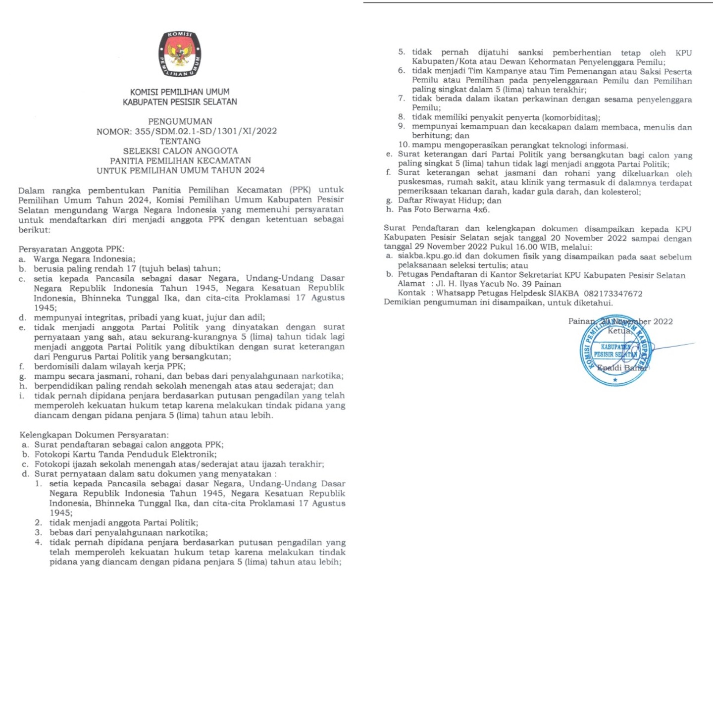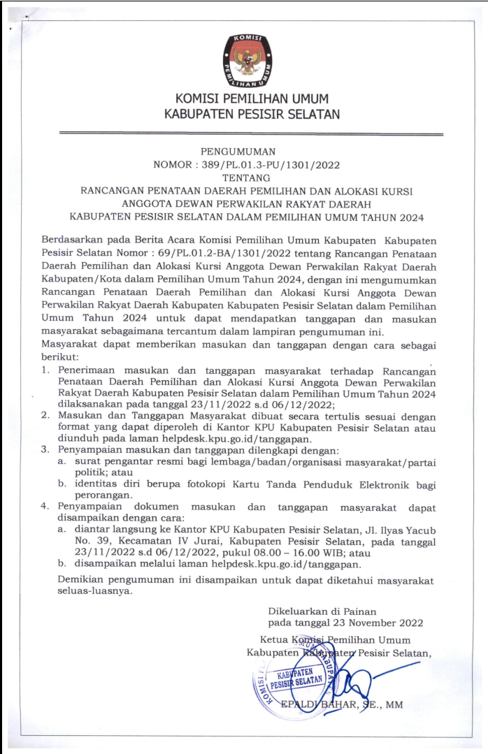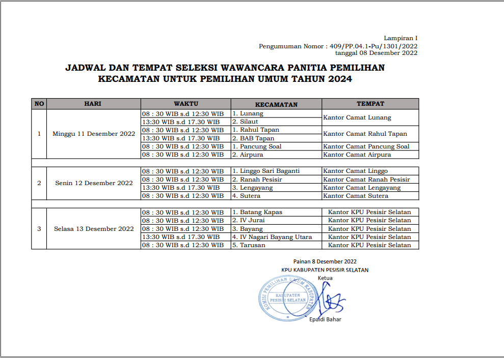 Dalam rangka pembentukan Panitia Pemilihan Kecamatan (PPK) untuk Pemilihan Umum Tahun 2024, Komisi Pemilihan Umum Kabupaten Pesisir Selatan mengundang Warga Negara Indonesia yang memenuhi persyaratan untuk mendaftarkan diri menjadi anggota PPK dengan ketentuan sebagai berikut: