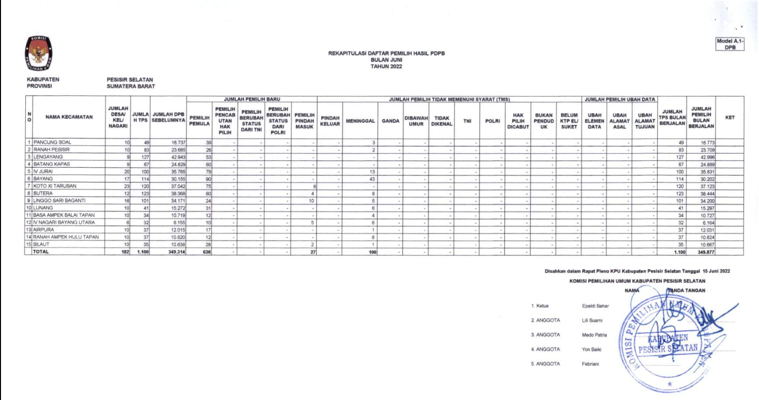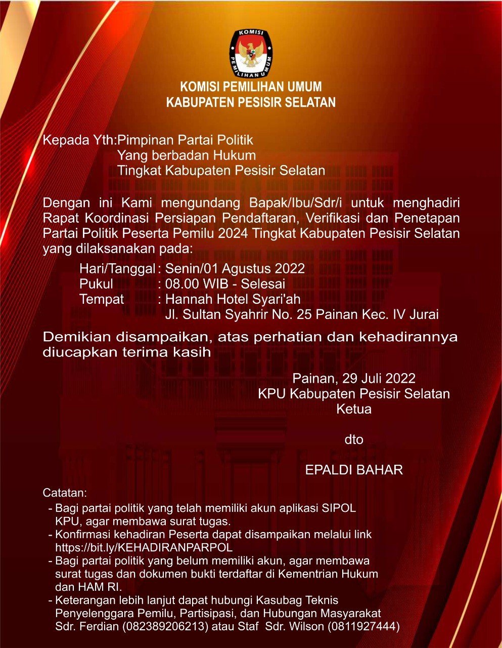 KPU Kabupaten Pesisir Selatan akan melaksanakan Rapat Koordinasi Persiapan Pendaftaran, Verifikasi, dan Penetapan Partai Politik Peserta Pemilu 2024 Tingkat Kabupaten Pesisir Selatan. Kegiatan akan dilaksanakan pada tanggal 1 Agustus 2022 di Hannah Hotel Syari'ah, Painan. Undangan terdiri dari satu orang perwakilan yang mewakili Partai Politik dengan membawa Surat Tugas dan Bukti Dokumen terdaftar di Kemenkumham RI. Untuk konfirmasi kehadiran silahkan mengisi daftar hadir pada : https://bit.ly/KEHADIRANPARPOL