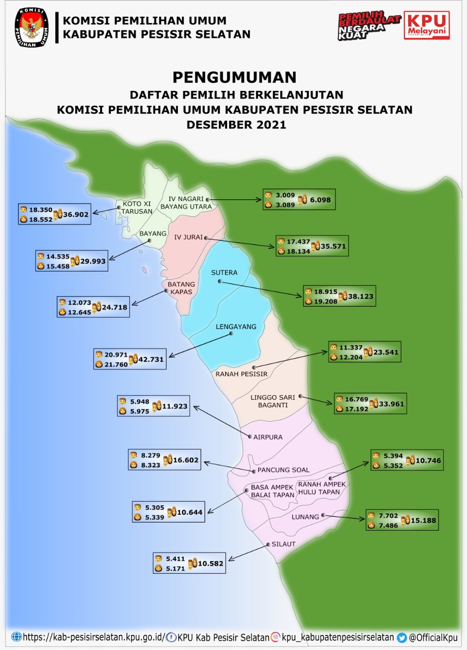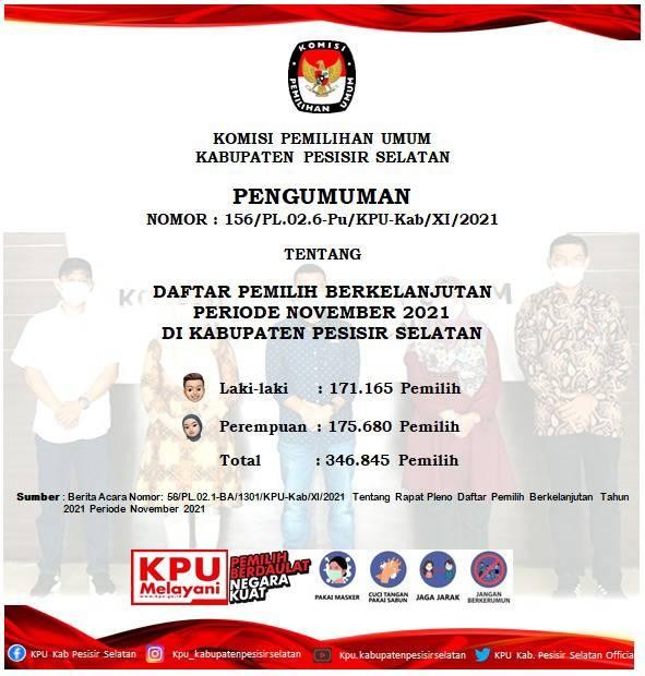 Berikut disampaikan Pengumuman Nomor: 156/PL.02.6-Pu/KPU-Kab/XI/2021 tentang Daftar Pemilih Berkelanjutan (DPB) Periode November 2021 di Kabupaten Pesisir Selatan.