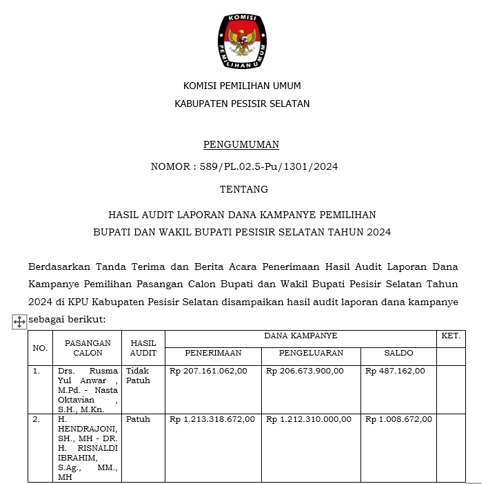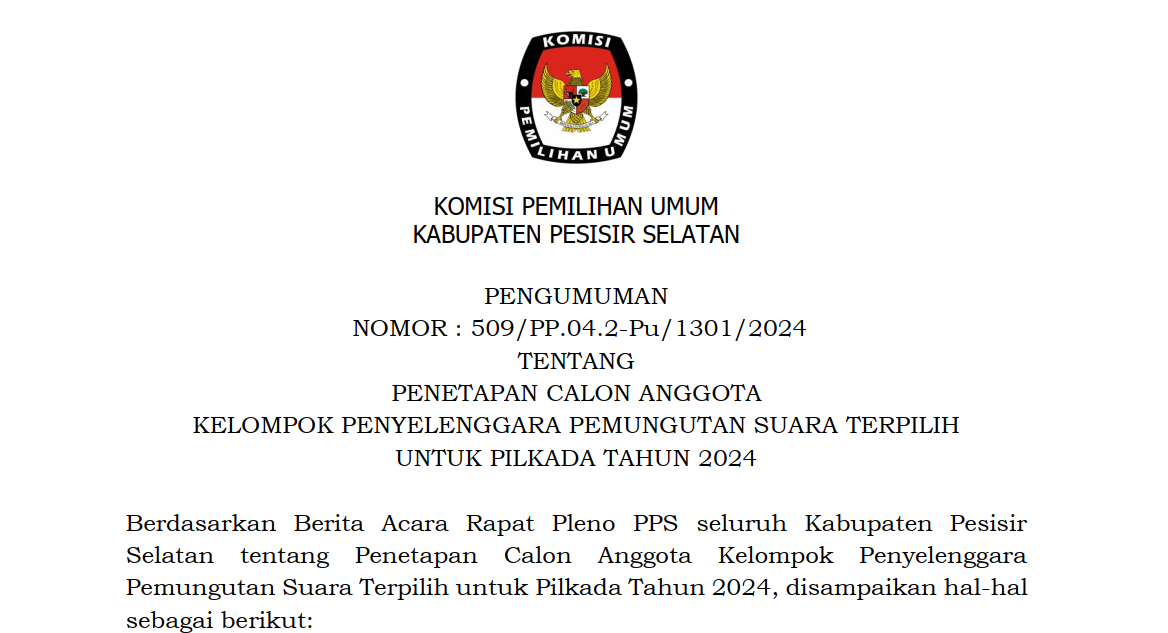 Untuk melaksanakan ketentuan Pasal 8 Peraturan Komisi Pemilihan Umum Nomor 13 Tahun 2024 tentang Kampanye Pemilihan Gubernur dan Wakil Gubernur, Bupati dan Wakil Bupati serta Walikota dan Wakil Walikota. Komisi Pemilihan Umum Kabupaten Pesisir Selatan mengumumkan nama Tim Kampanye Pasangan Calon Bupati dan Wakil Bupati Pesisir Selatan Tahun 2024.