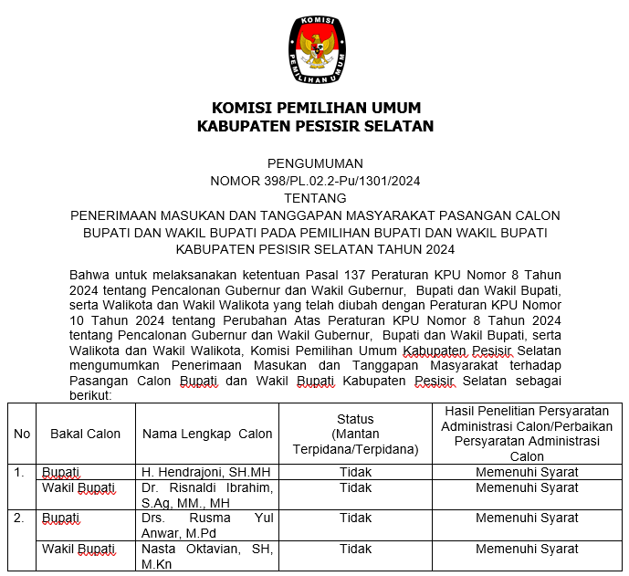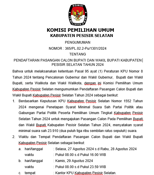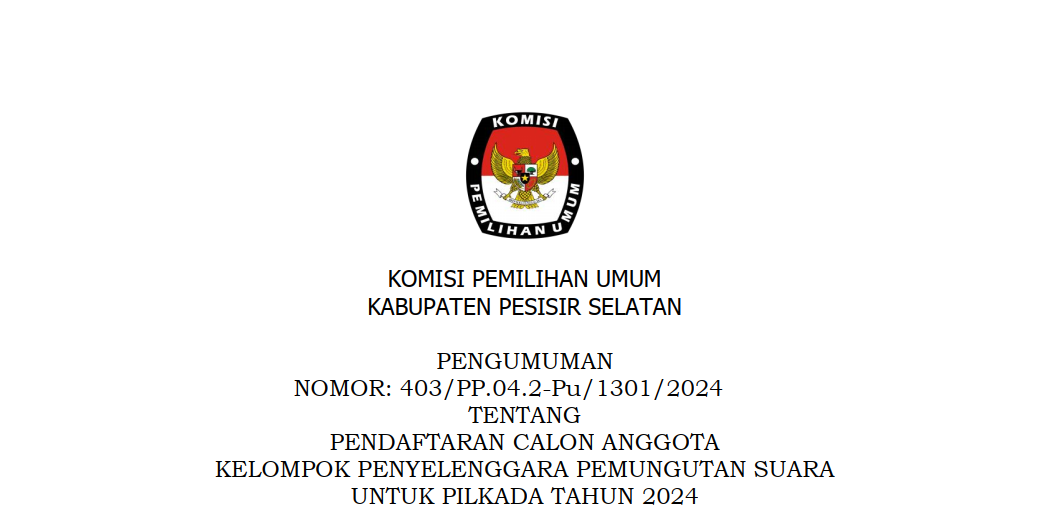 Painan - Dalam rangka pembentukan KPPS untuk Pemilihan Gubernur dan Wakil Gubernur dan Bupati dan Wakil Bupati Tahun 2024, Komisi Pemilihan Umum Kabupaten Pesisir Selatan mengundang Warga Negara Indonesia yang memenuhi persyaratan untuk mendaftarkan diri menjadi anggota KPPS untuk Pemilihan Umum dengan ketentuan sebagai berikut: