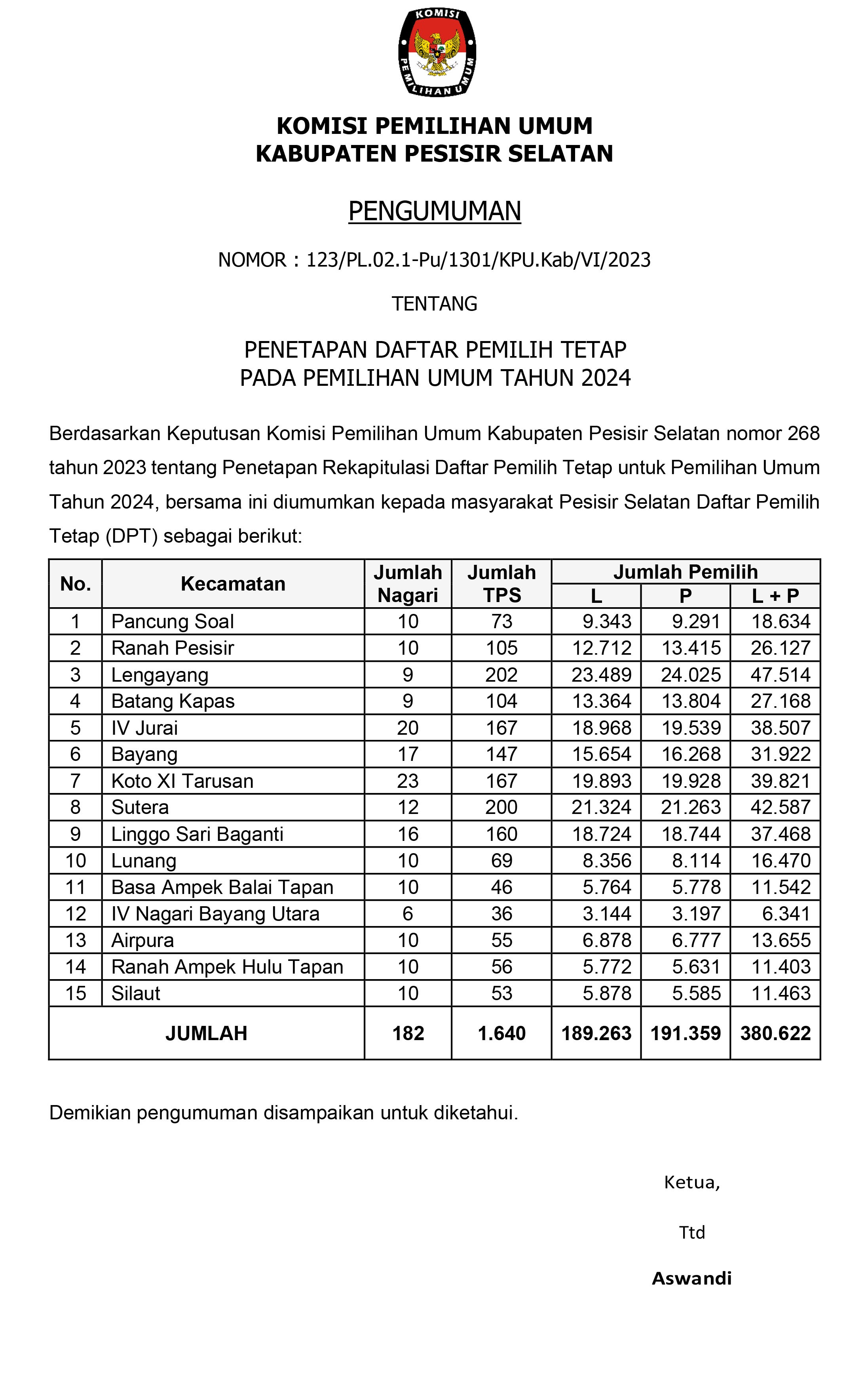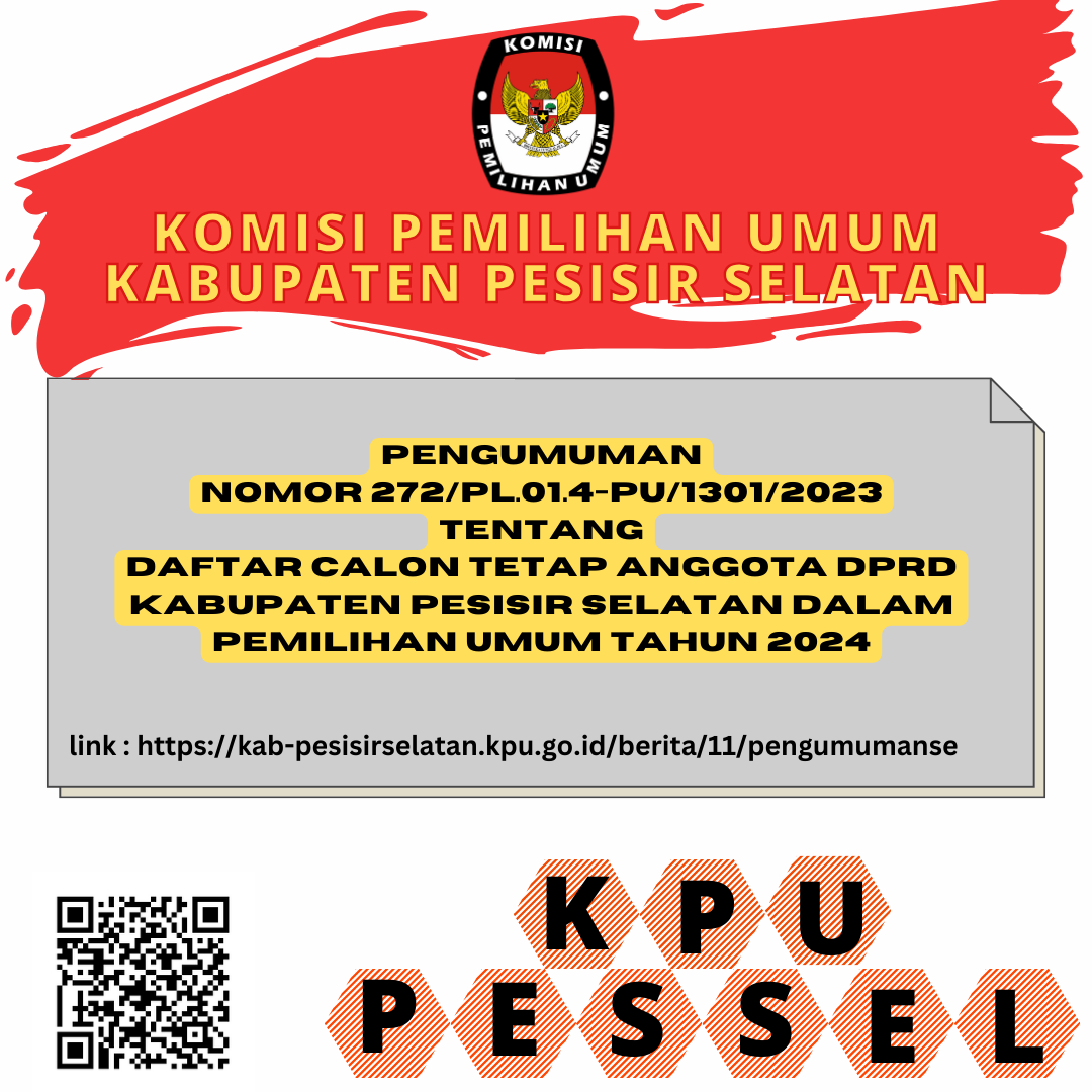 Painan - Bahwa untuk melaksanakan ketentuan Pasal 70 Peraturan KPU Nomor 10 Tahun 2023 tentang Pencalonan Anggota Dewan Perwakilan Rakyat, Dewan Perwakilan Rakyat Daerah Provinsi, dan Dewan Perwakilan Rakyat Daerah Kabupaten/Kota, KPU Kabupaten Pesisir Selatan mengumumkan Daftar Calon Sementara (DCS) Anggota DPRD Kabupaten Pesisir Selatan dan persentase keterwakilan perempuan dalam Daftar Calon Sementara (DCS) sebagaimana terlampir.
